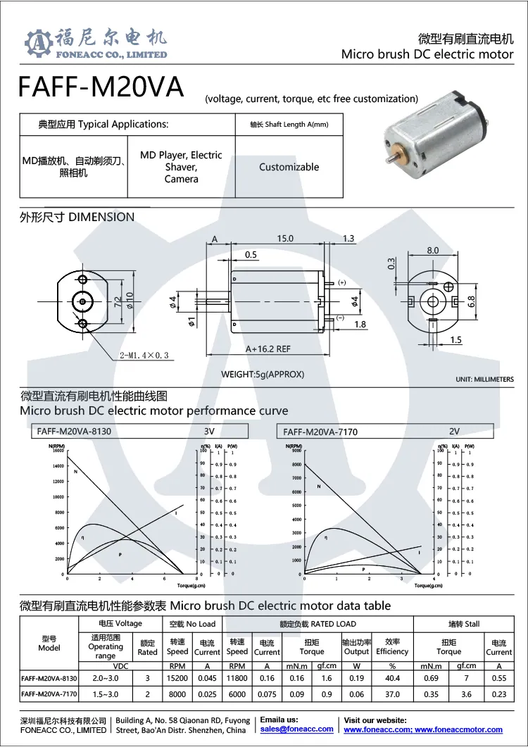 The datasheet of FF-M20VA micro brush dc electric motor is as below: